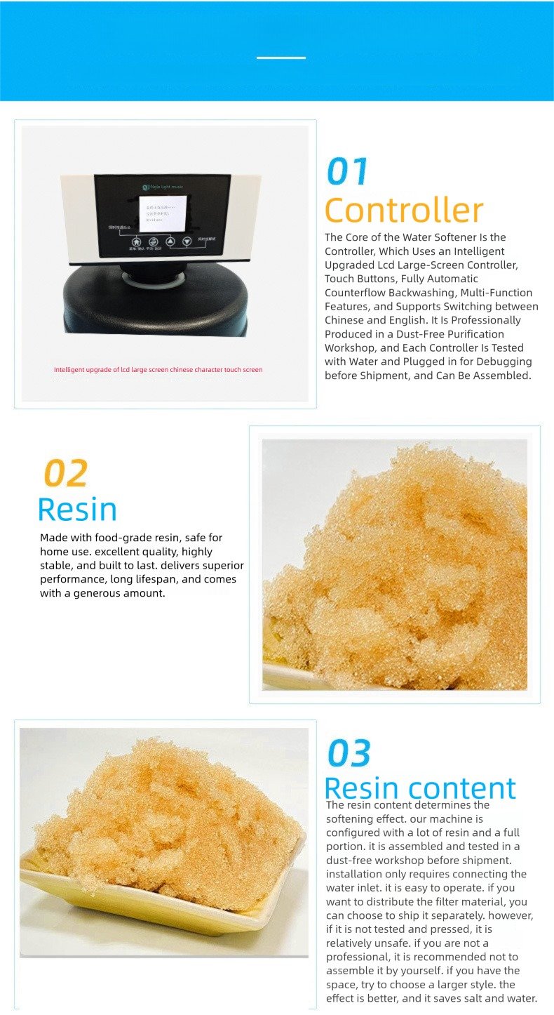 Counterflow Backwashing: This advanced technology ensures thorough resin regeneration, significantly saving water and salt compared to traditional models.