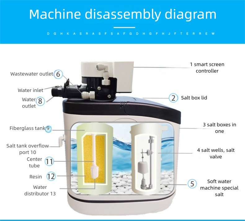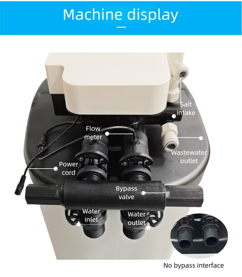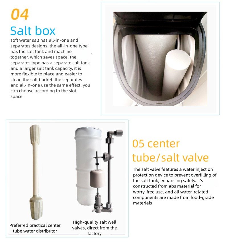 Fiberglass Tank & ABS Components: The core pressure tank is made of high-strength fiberglass, while the salt valves and center tubes utilize high-quality ABS material for corrosion resistance and durability.