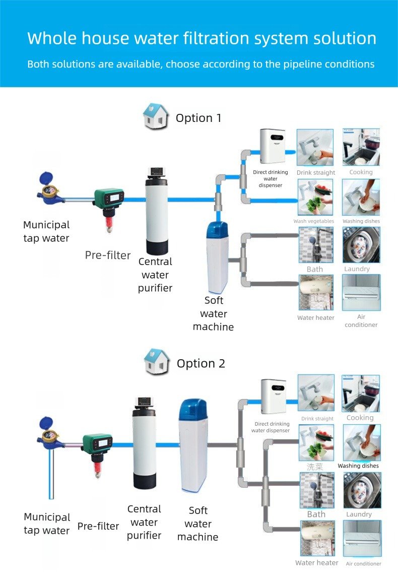 Option 2: Municipal Water → Pre-filter → yourwatergood Softener → Central Purifier → Household Use.