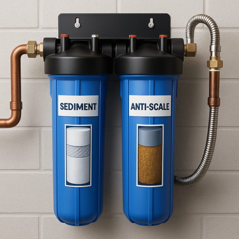 Together, these two filters create a balanced system—removing sediment first, then tackling scale and hardness issues.